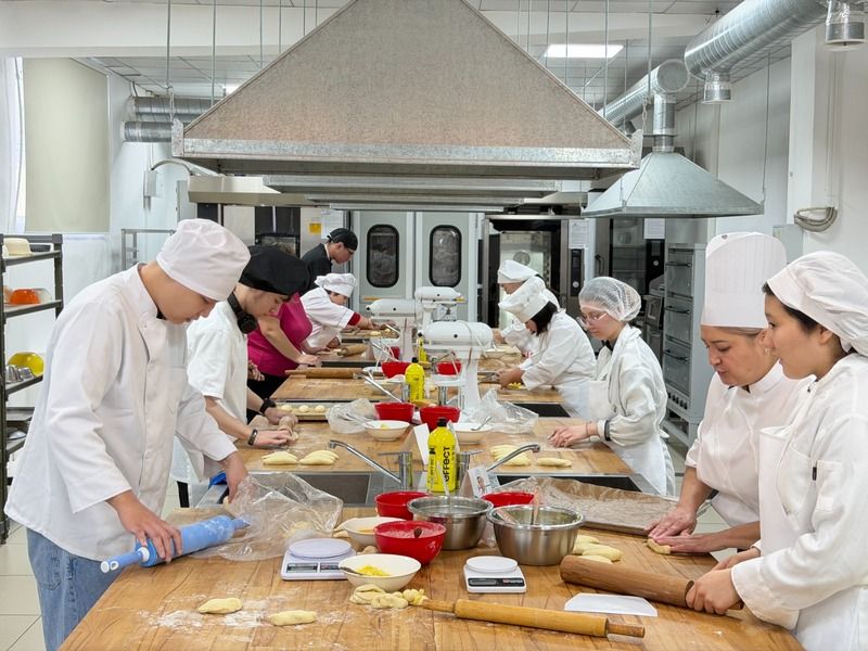 В декабре прошлого года в Карагандинском колледже питания и сервиса открылся учебно-производственный комбинат по направлению «Кондитерское дело», где обучение совмещено с практикой и поддержкой наставников, о чем сообщили в акимате области. На открытом занятии ребята продемонстрировали, чему уже научились: готовили изделия из теста, работали с кремом, оформляли десерты.
