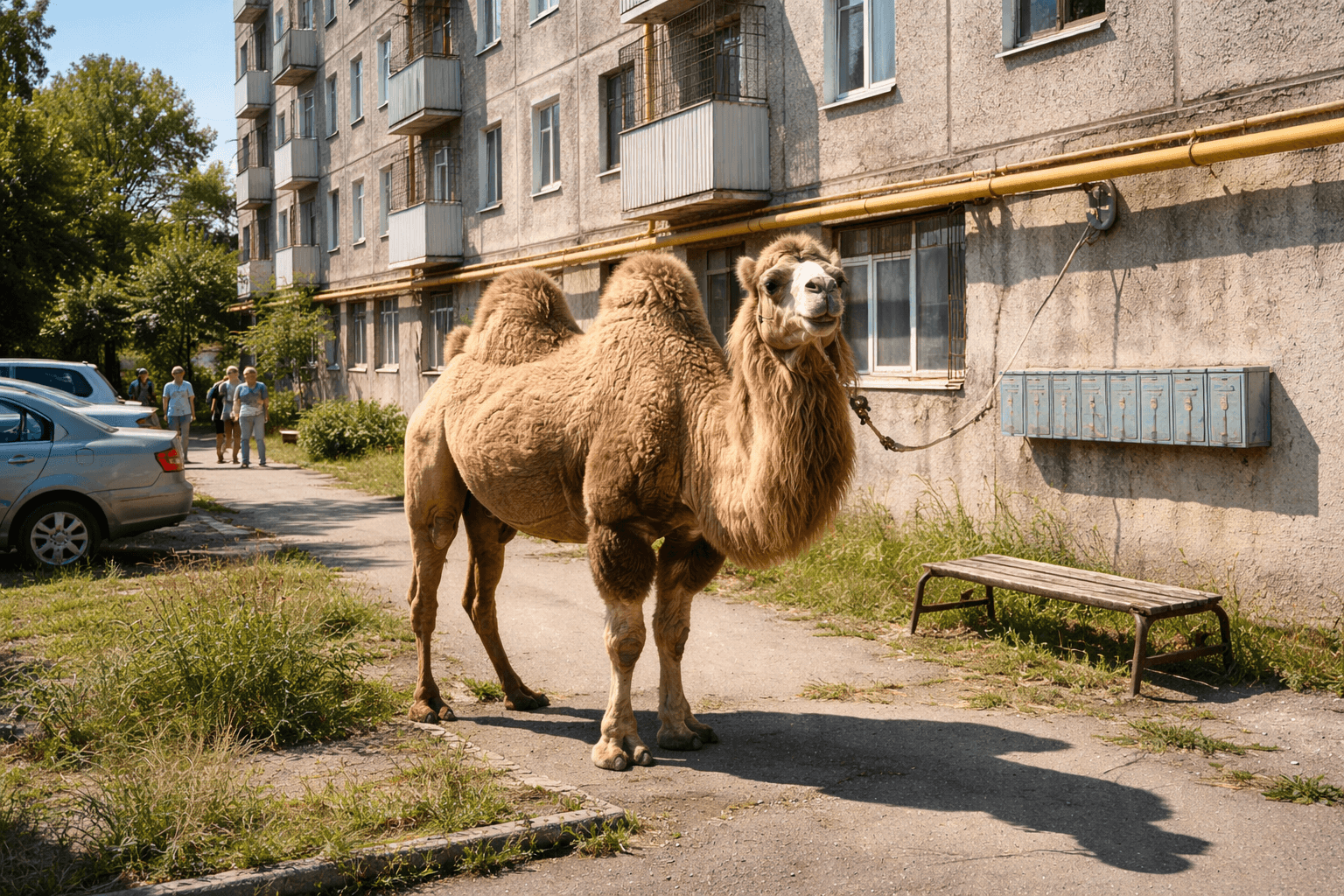 В Актау верблюда привязали прямо к газовой трубе у стены пятиэтажного жилого дома. Видео с животным быстро распространилось в соцсетях и вызвало бурное обсуждение среди горожан.