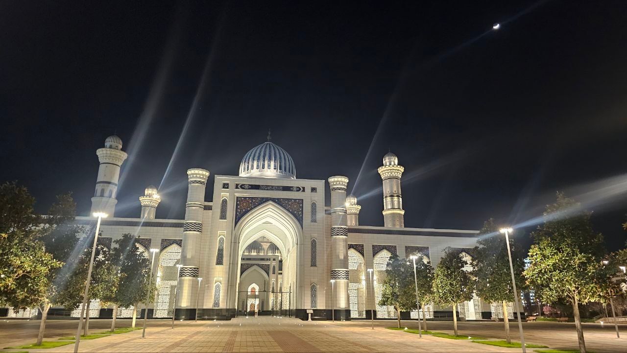 Этот красивый день мы решили завершить красивым вечером — увидеть Центральную соборную мечеть Душанбе. Мечеть Имама Абу Ханифы открыли в 2023 году, строили ее почти пятнадцать лет. Огромная, светлая, с четырьмя минаретами высотой около 75 метров и большим куполом, мечеть одновременно вмещает до 130 тысяч человек, а площадь внутреннего ковра составляет один гектар! Внутри есть библиотека, учебные залы, музей и просторный двор с фонтаном. Ощущение масштаба, в котором переплелись традиции таджикской архитектуры и современный размах, особенно впечатляет вечером.
