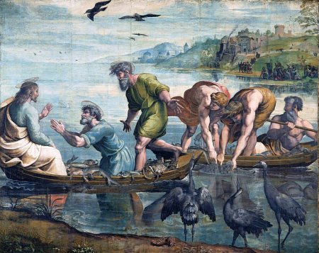 Как и прочие живописцы Высокого Возрождения, а особенно те, что обращались к библейским сюжетам, Рафаэль был склонен уходить в символизм. Так, на “Чудесном улове” можно заметить, что в небе парят вороны, а на берегу сидят журавли. Если первые олицетворяют греховные побуждения, неустанно кружащие над человеком, то вторые — неизменную бдительность, присущую каждому духовному настоятелю.