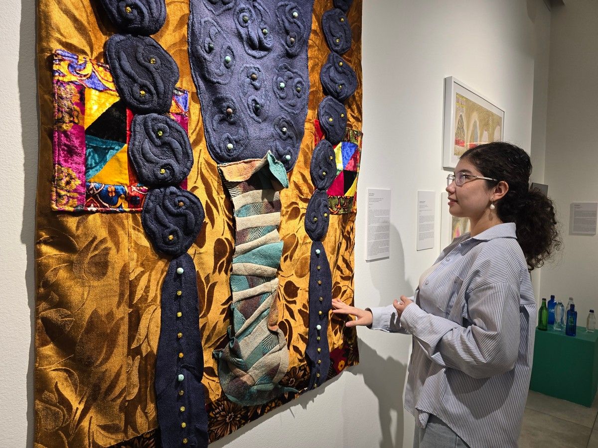 Разнообразие фактур — валяние, вышивка, бисер. Здесь оно мастерски собрано в цельную структуру без ощущения фрагментарности. Яркие текстильные элементы отсылают к домашнему пространству и семейной памяти. В контексте выставки работа раскрывает тело как форму, сформированную традицией: между раскрытием и удержанием, индивидуальным переживанием и культурным кодом.